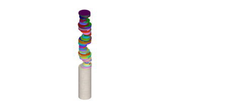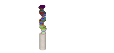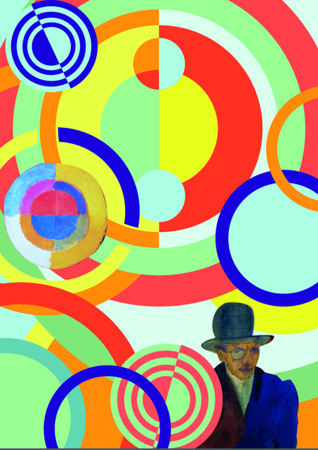 Серия дисков разного диаметра, расположенных на одной оси. На каждом диске — яркие, чистые цветовые поля в стиле Делоне, как на его полотнах «Круглые формы» или «Симультанные диски».