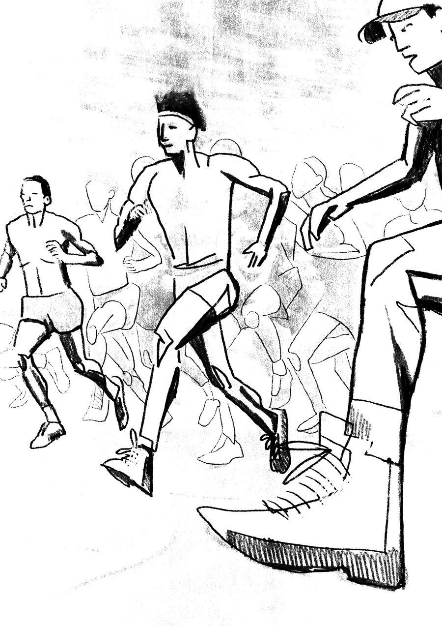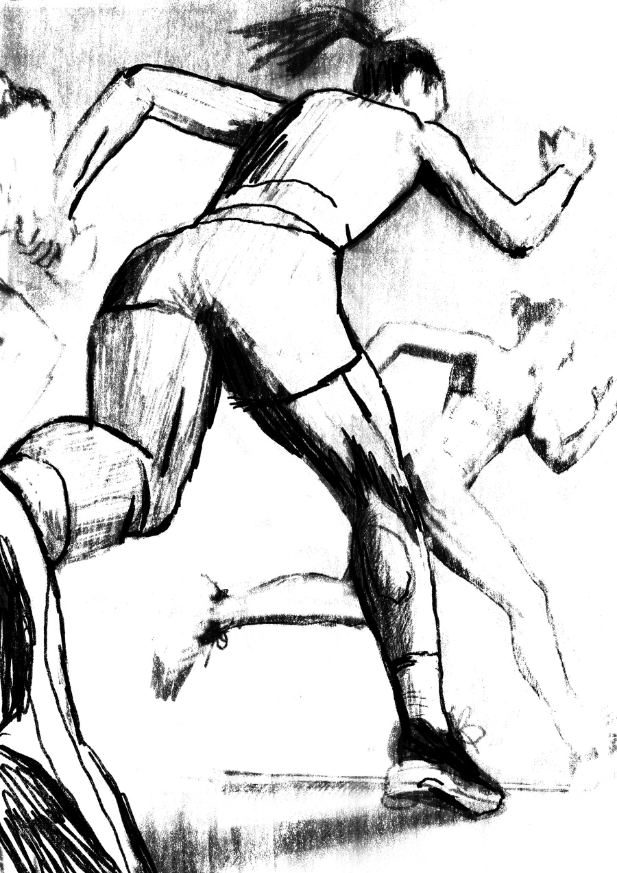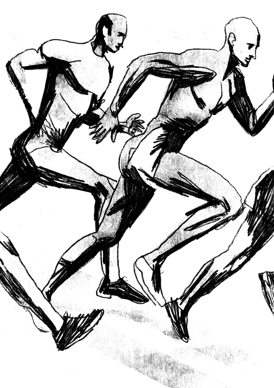Графическая серия, многофигурных композиций, посвящённая движению. Меня интересовало, как в линии и пластике можно передать энергию бега — не через анатомическую точность, а через ритм, импульс и направление. В этих иллюстрациях фигуры теряют статичность и становятся частью самого движения.