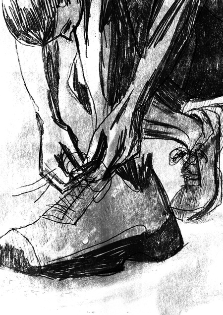 Работы, выполненные в сочетании угля, трафаретов и жёстких графичных материалов, передают ощущение живого движения: линии остаются резкими, энергичными, будто несутся вперёд вместе с фигурой.