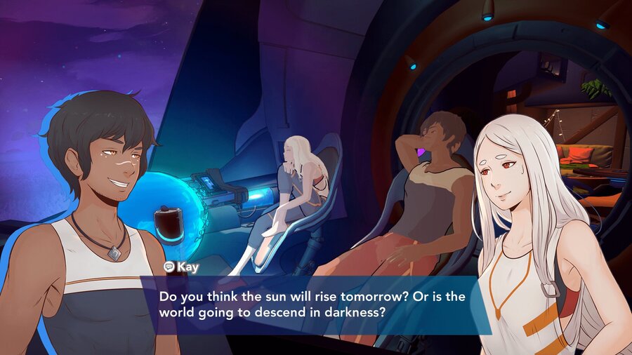 Один из способов решения данной проблемы — изолирование окна выбора действия. Спрайты персонажей и диалоговые окна временно скрываются и на экране остаются только плашки реплик на фоновом изображении.
