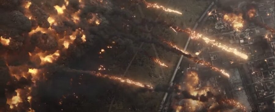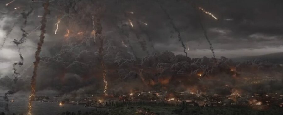 Сам эффект выглядит куда более правдоподобно, чем в фильме «2012», vfx дизайнерам даже не потребовалось показывать огромную ударную волну в небе, чтобы продемонстрировать масштабы получившегося эффекта. Можно заметить, насколько продвинулась 3D графика за эти годы. Даже вдали дым выглядит очень качественным, а огненные камни создатели не постеснялись практически добросить до камеры, потому что детализация дыма и огня просто умопомрачительная.