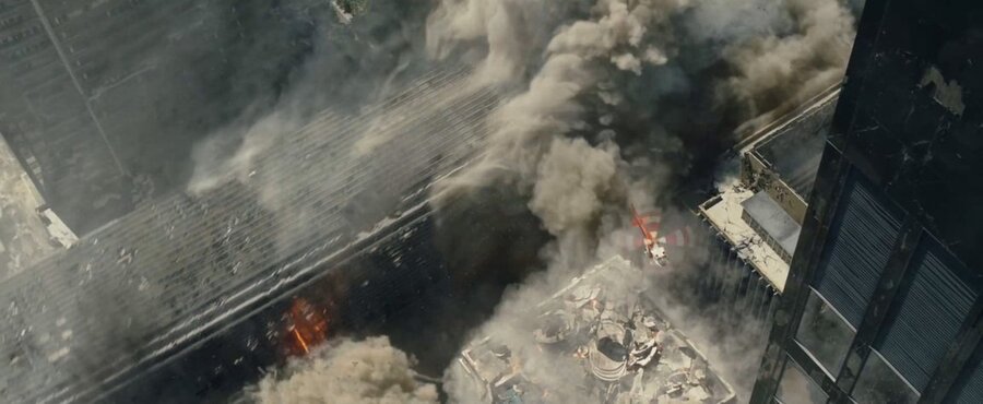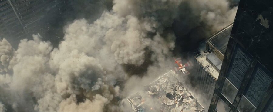 Невозможно не упомянуть сцену с падающими высотками, которые создатели решили сложить «эффектом домино». В одном из интервью супервайзер говорил о том, что получившаяся сцена «красива, но абсолютно ненаучна». Огромное количество пыли, красивое падение, но сомнительно выглядящее разрушение. Чего же не хватает в этих кадрах?