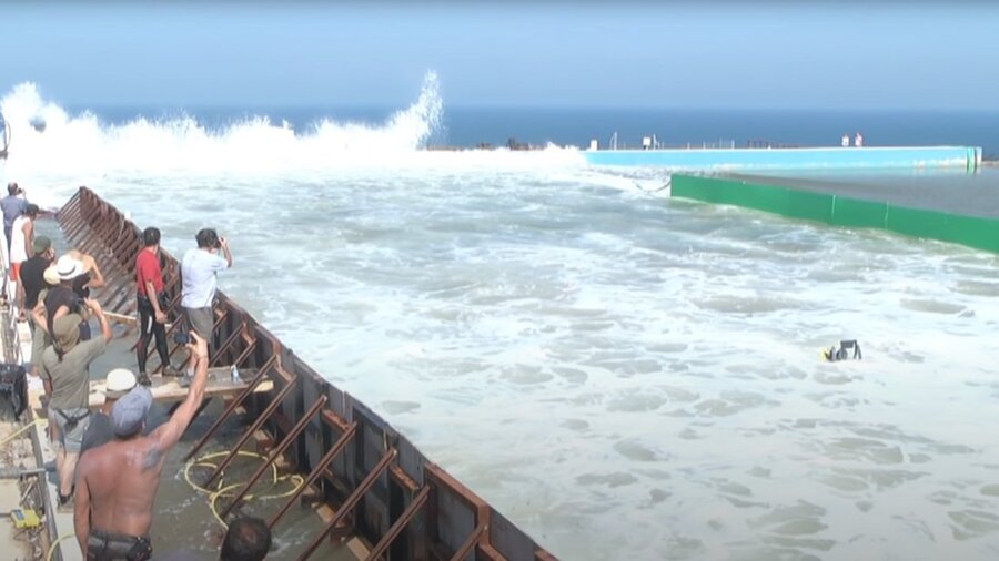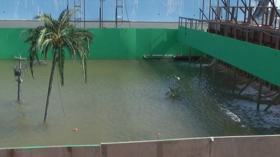 Для разрушения настоящих макетов нужна реальная вода. Как можно заметить, даже для водяного потока была создана отдельная конструкция, которая удерживала жидкость. По команде режиссёра преграда, сдерживающая воду, поднимается и волна под сильным напором устремляется вперёд.