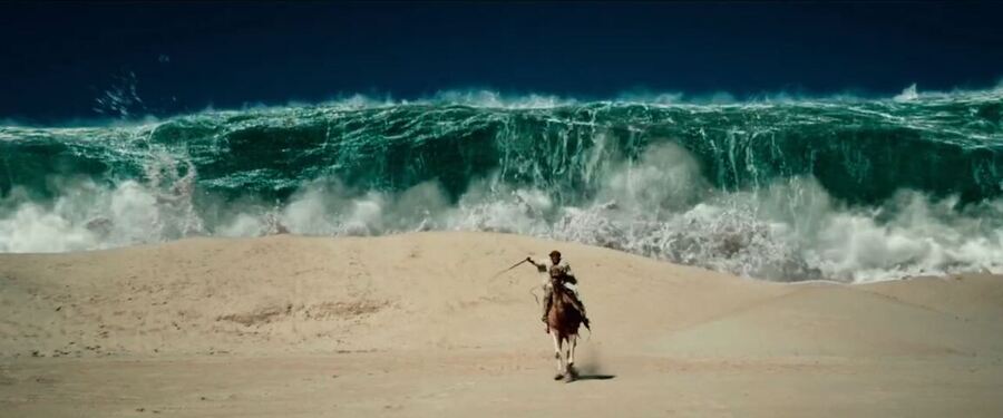 А вот кадры с волной в пустыне в Арабский Эмиратах получились, пускай и красивыми, но немного сомнительными. Волна, прошедшая через часть пустыни, должна была вобрать в себя часть песка и поменять цвет на более грязный. Лазурный цвет океана в данном шоте создаёт ощущение, что вода была просто наложена, даже у обычного зрителя. Более того, на этих кадрах видно, насколько странной выглядит форма волны и пена, что находится на ней. Когда волна приближается, пена на ней выглядит практически статичной, она как будто просто слегка отползает назад. Создаётся впечатление, будто на «объект» воды наложили статичную текстуру. Нехарактерное поведение воды так же ставит под вопрос реалистичность данной сцены, так как бьющая в землю волна должна уменьшится в размере, а она продолжает расти.