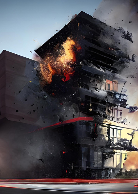 Далее ключевые объекты в сцене моделируются и командой аниматоров разбиваются на части. До определённого момента уже разрушенные объекты держат исходное состояние при помощи констрейнов, после чего подвергаются воздействию силы и ломаются. Можно сравнить это с реальными разрушениями, так как малейшие трещины могут положить всю конструкцию, если приложить силу. Полученная 3D композиция далее рендерится и на композитинге подставляется в качестве бэкграунда или окружающих объектов, а так же подвергается постобработке: цвето и светокоррекции, чтобы общий кадр сочетался.