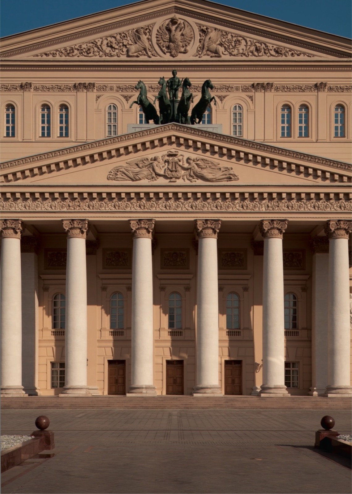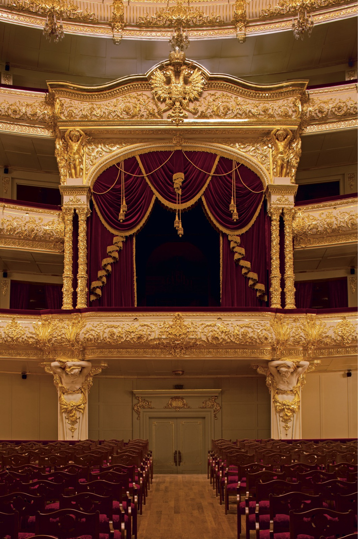 Главный фасад, статуи муз Эраты и Терпсихоры в нишах главного фасада, царская ложа после реконструкции. Фото Егор Заика