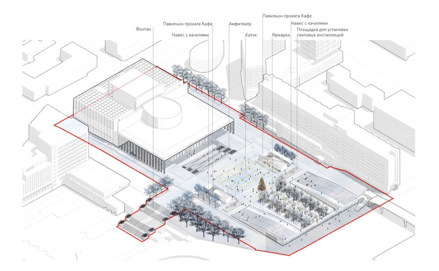 В проекте видно стремление архитекторов сохранить целостность театра, его площади и набережной, а также стремление расширить зону для пешеходов. По проекту парковка на территории площади будет запрещена, места для машин выделены на двух подземных этажах под площадью.