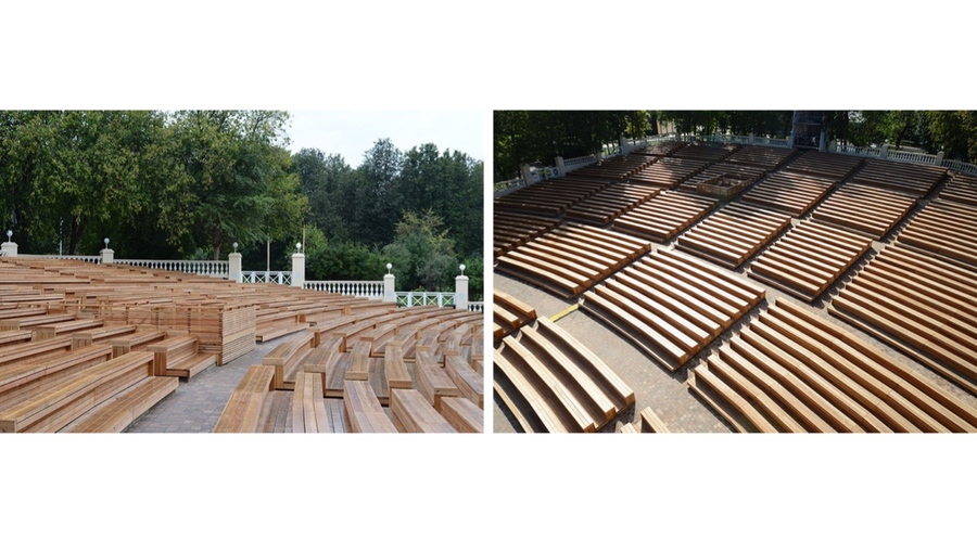 Старые театральные кресла амфитеатра были сломаны из-за выросших деревьев. Новый театр строился на основе контуров старого. Были залиты бетонные ступени выстроены места для зрителей. Теперь вместо кресел в амфитеатре стоят деревянные скамейки. Маркировка рядов завершила задуманный облик Зеленого театра. Сама по себе архитектура ВДНХ это классика, только в 30-х это была римская классика, а в 50-х русский классицизм с более патриотическим акцентом.