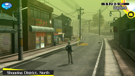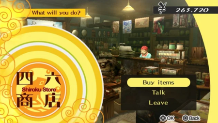 Persona 4 Golden, Atlus, 2008, взаимодействие с магазином на торговой улице