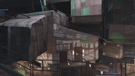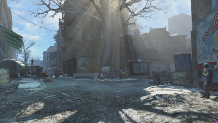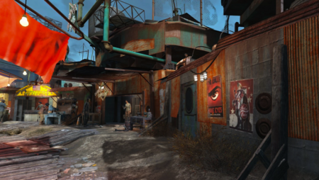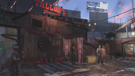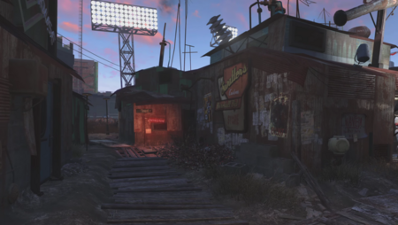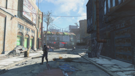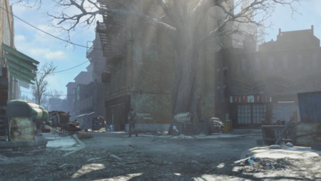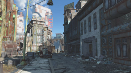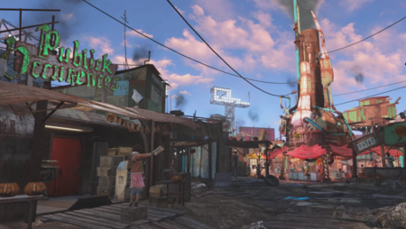 Это произошло в Fallout 4 (2015). Новое поселение Даймонд-сити создаёт ощущение контраста за счёт своей формы, архитектуры и места, где оно расположено на обломках старого Бостона.