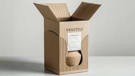 The image showcases a tall, slender cardboard box with a unique textured design. It’s branded as «Vasotele» and appears to be packaging for a vase, as indicated by the label. The box is open at the top, revealing the corrugated cardboard interior. The overall aesthetic is minimalist and modern, with a focus on sustainability due to the use of cardboard. The neutral color palette and simple design elements create a sense of elegance and sophistication.