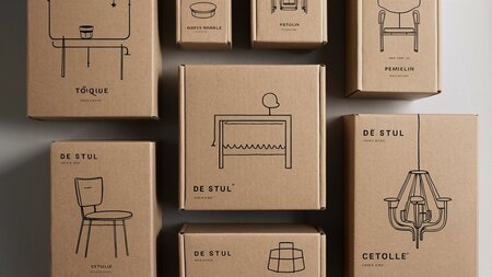 The image presents a collection of cardboard boxes, presumably for furniture items, showcasing a minimalist and modern packaging design. Each box features a simple line drawing of the item it contains, along with the product name and brand «De Stul». The boxes vary in size, suggesting different furniture pieces like a coffee table («Toqque»), a chair («Pemielin»), and a chandelier («Cetolle»). The design is consistent across all boxes, creating a cohesive and recognizable brand identity. The use of cardboard implies a focus on sustainability and eco-friendliness. The overall impression is one of elegance and sophistication, achieved through the clean lines, neutral color palette, and minimalist approach.