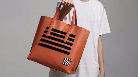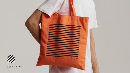 The image showcases a person holding an orange tote bag with a minimalist design. The bag features a pattern of black horizontal lines of varying widths, creating a modern and stylish look. In the bottom corner, a logo consisting of a striped «S» is accompanied by a numerical code. The person is wearing a plain white t-shirt, allowing the focus to remain on the bag and its design. The overall aesthetic is simple yet sophisticated, reflecting a contemporary and urban style.