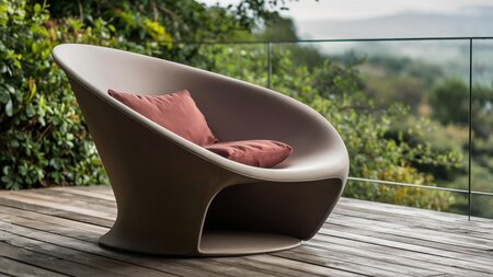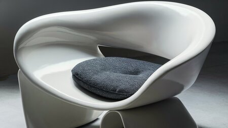 The image showcases a modern, minimalist chair with a unique design. The chair is predominantly white, constructed from a material that appears to be smooth and slightly reflective. Its most striking feature is the continuous, curving form that creates both the seat and the back, giving the chair a sense of fluidity and movement. Adding a touch of contrast, a cylindrical cushion in a soft, textured, dark gray fabric is nestled within the curve of the chair, providing both visual and physical comfort. The chair’s design appears to prioritize both aesthetics and ergonomics, suggesting it would be suitable for a variety of contemporary settings.