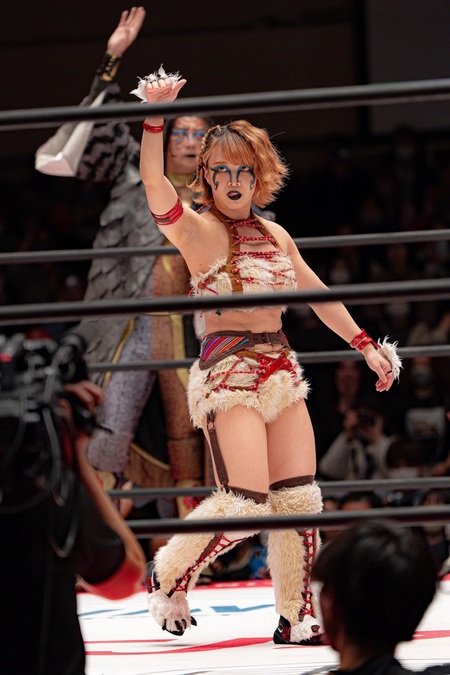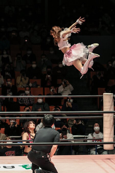 Японский женский реслинг джоши пуроресу отличается своей уникальной эстетикой. Костюмы участниц часто вдохновлены аниме и современными японскими уличными стилями, включая стиль «лолита» — например, образ Мизуки Кадинабе сочетает нежные кружевные вставки, легкие ткани, пышную юбку и светлую палитру. Каждый наряд уникален, детализирован и подчёркивает индивидуальность рестлерши. Материалы варьируются от традиционных тканей до современных синтетических смесей и даже латекса. При этом удобство таких костюмов вызывает вопросы: они больше ориентированы на привлечение мужской аудитории и выстраивание фан-базы, нежели на свободу движений в ринге.