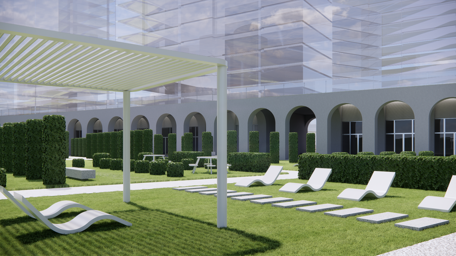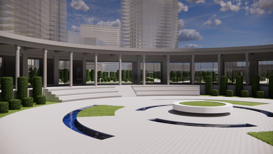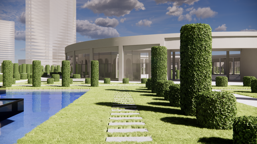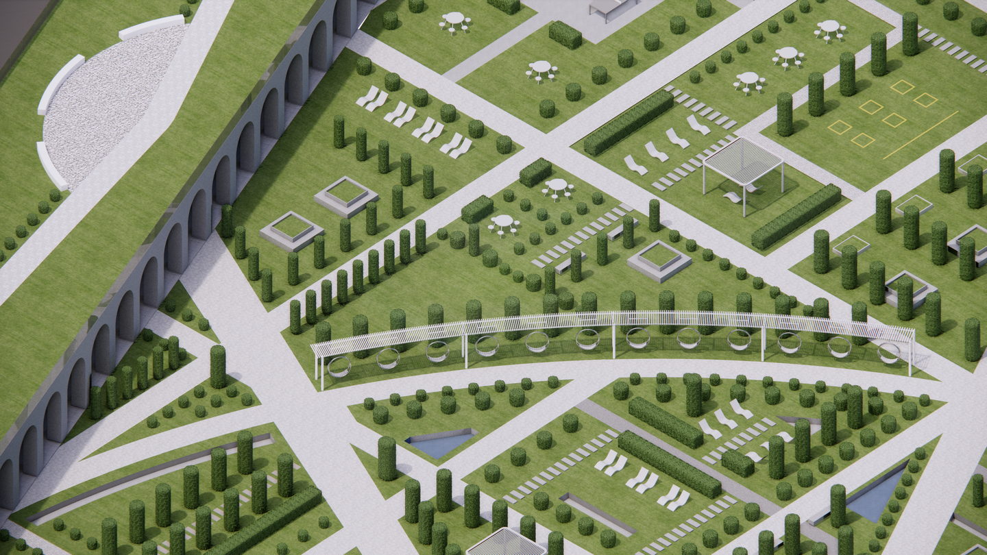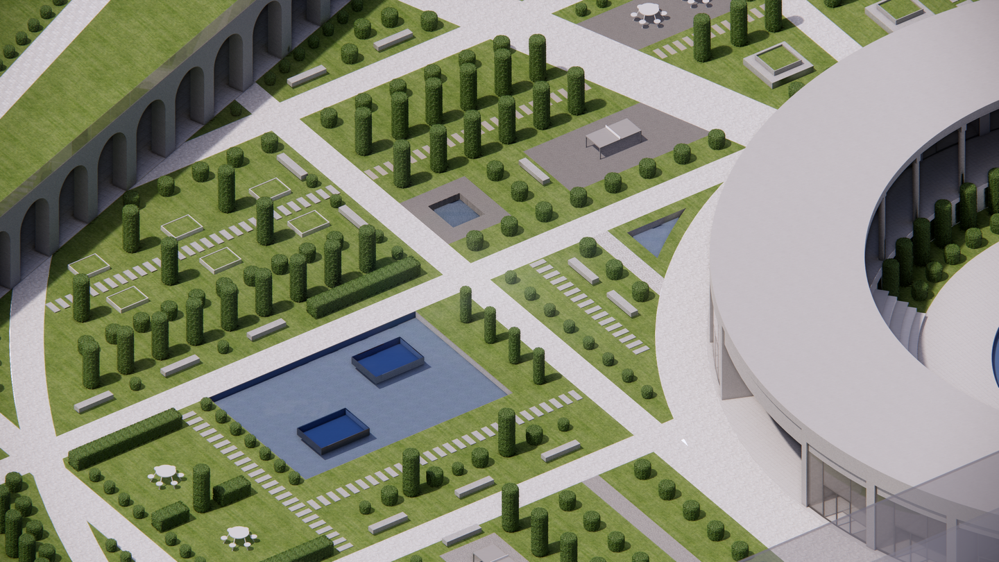 1 — Галерея с садом на крыше 2 — Круглый павильон 3 — Площадь с амфитеатром