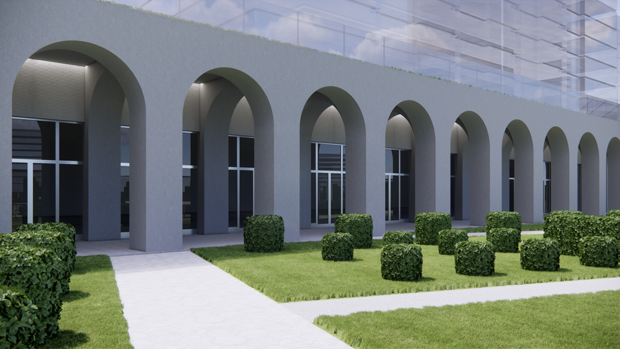Круглый павильон разделен на 24 торговые ячейки одинакового метража. Панорамное остекление ячеек обеспечивает вид как внутрь, вод двор, так и на внешний бульвар.