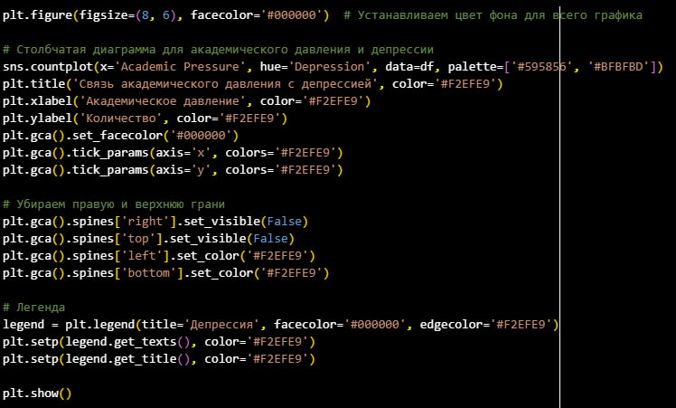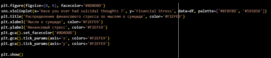 Для визуализации данных я выбрал круговую диаграмму (наглядно показывает соотношение студентов с депрессией и без неё), гистограмму (хорошо показывает разброс в возрастной группе), виоловая диграмма (позволяет легко увидеть плотность данных и различия между двумя категориями), столбчатая диаграмма (позволяет наглядно сравнить количество студентов с депрессией и без, в зависимости от уровня давления) и площадно-линейный график (помогает визуализировать, как изменяется количество учебных часов в зависимости от уровня академического давления, выделяя общие тренды и закономерности.)