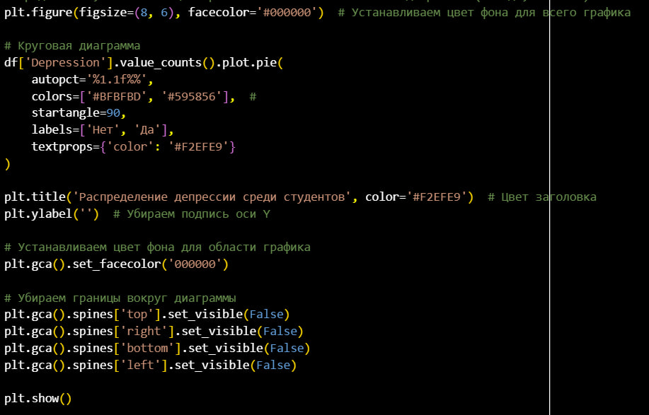 Для круговой диаграммы я определяю что столбец Depression в данных отображает наличие депрессии среди студентов, где 1 означает «Да» (есть депрессия), а 0 — «Нет» (депрессии нет). Далее я использую df['Depression'].value_counts (), чтобы подсчитать количество значений 1 и 0 в столбце Depression.