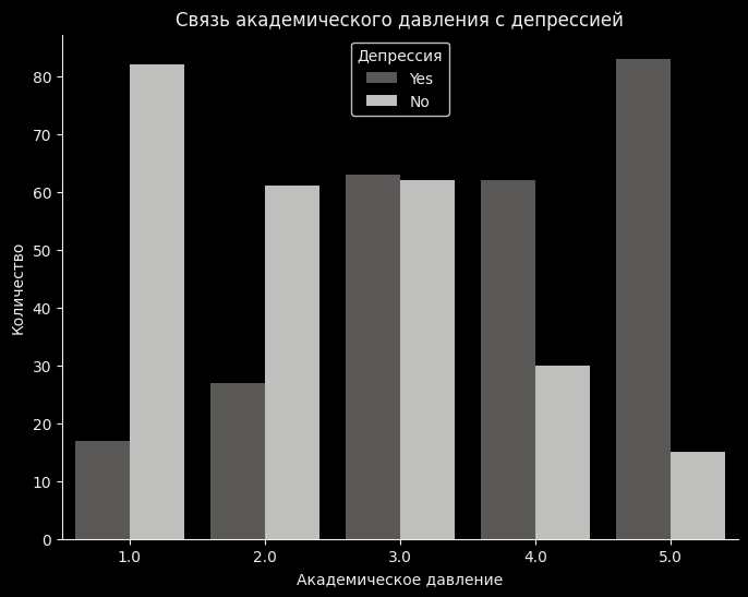 График показывает, что с увеличением академического давления увеличивается и количество студентов, страдающих депрессией. Скорее всего высокий уровень академического давления оказывает сильное влияние на психоэмоциональное состояние студентов.