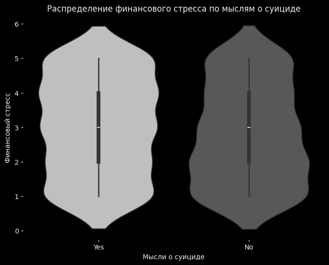 Этот график показывает, что студенты с мыслями о суициде имеют более высокий и более широкий уровень финансового стресса по сравнению с теми, у кого нет таких мыслей. Это может указывать на более тяжелую нагрузку и стресс у студентов, переживающих такие психоэмоциональные трудности.