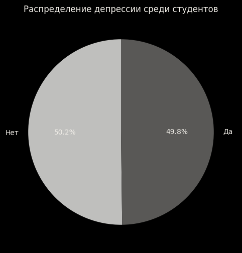 Круговая диаграмма показывает, что среди студентов, участвующих в исследовании, практически равное количество тех, кто испытывает депрессию, и тех, кто не сталкивается с этим состоянием.
