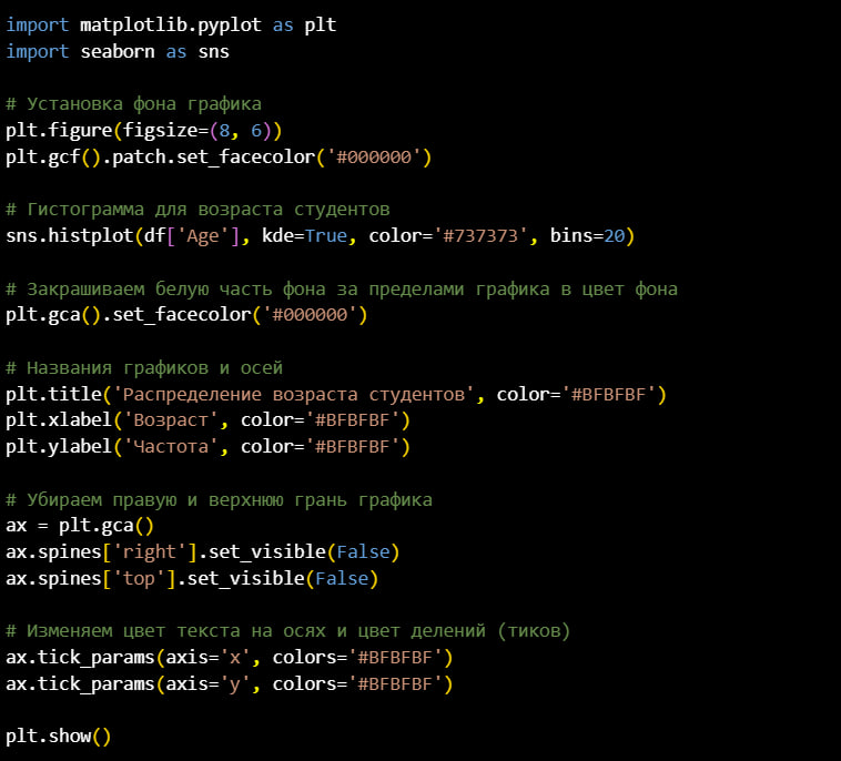 После чего приступил к подготовке данных для гистограммы. Используя функцию sns.histplot я вывел данные о возрасте опрошенных студентов из столбца «Age».