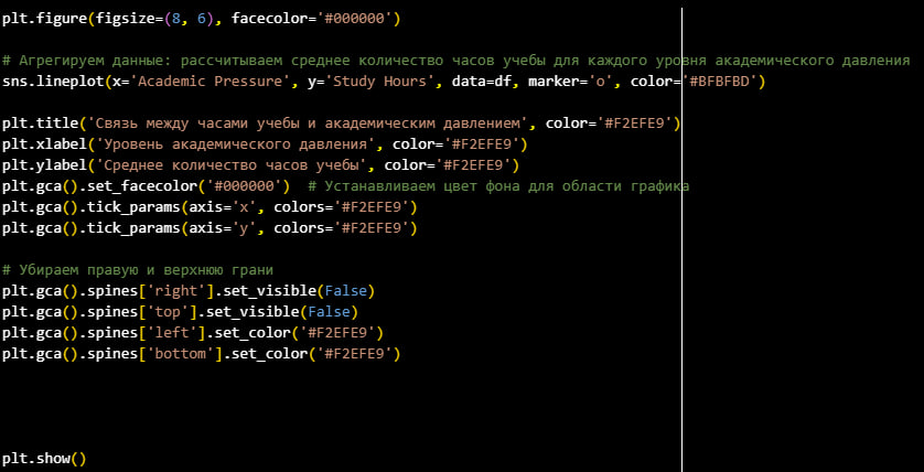 График показывает, что студенты с более высоким академическим давлением, вероятно, тратят больше времени на учебу, что может быть связано с повышенными требованиями и стрессом. Чем выше уровень академического давления, тем больше времени студенты, вероятно, посвящают учебным занятиям.