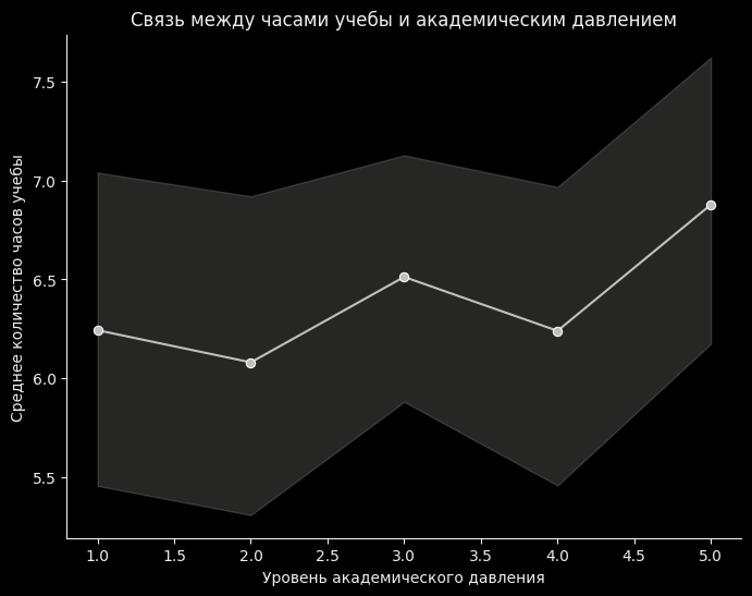 Для площадного графика, я рассчитывал среднее количество часов учебы для каждого уровня академического давления. Для этого использовал функцию sns.lineplot, которая строит линейную диаграмму. На оси X отображается Academic Pressure (уровень академического давления), на оси Y — Study Hours (среднее количество часов учебы).