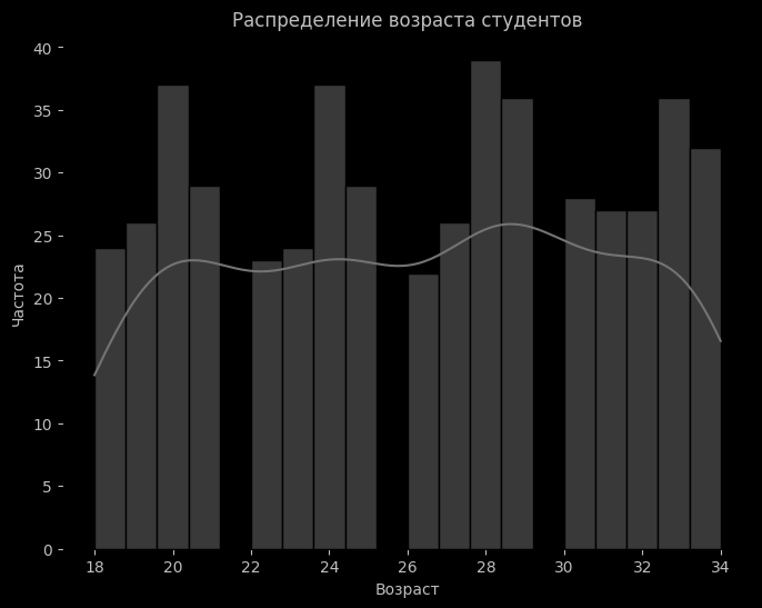 Из гистограммы видно, что большинство студентов находятся в возрастных группах 20-28 лет, и с возрастом количество студентов значительно снижается.