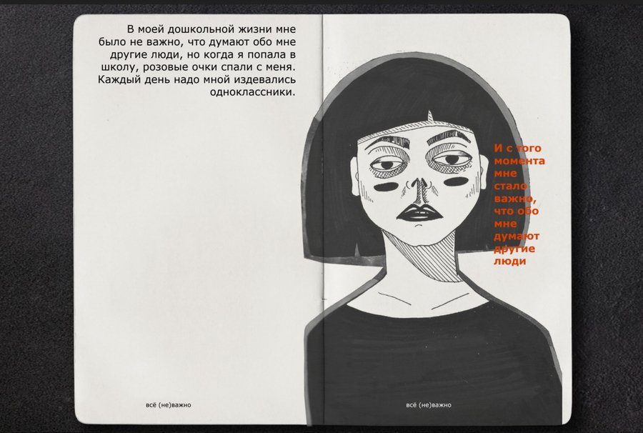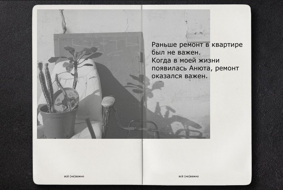 Это истории моих друзей. А в вашей жизни что-то важное теряло смысл? Или что-то, прежде неважное, становилось вдруг самым важным? Напишите об этом, и ваша история войдёт в книгу проекта «Всё (не)важно». Она станет продолжением инсталляции, которую мы сделаем вместе.