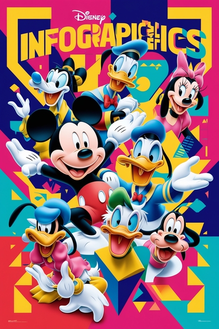vibrant, colorful poster featuring a mashup of beloved Disney cartoon characters from various franchises, such as Mickey Mouse, Donald Duck, Goofy, and Disney Princesses, amidst a visually striking infographics design with bold lines, geometric shapes, and playful typography, blending nostalgic charm with modern graphic elements, set against a bright, contrasting background that makes the characters and graphics pop, with each character showcasing their unique personality and facial expressions, from Mickey’s cheerful smile to Donald’s mischievous glint, and Goofy’s lovable goofiness, with bold, expressive lines and dynamic composition that creates a sense of energy and movement, perfect for a fun and quirky poster that celebrates the magic of Disney cartoons.