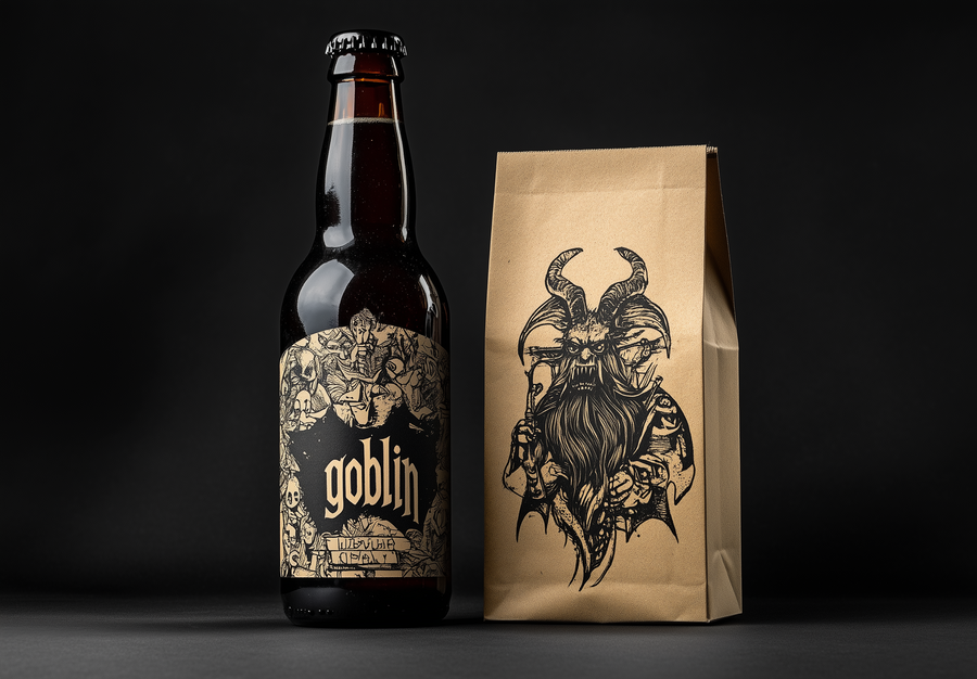1. A full-body mockup of a craft beer bottle with «goblin» written on the label in large letters and dark slavic mystery illustration, wrapped up and sitting next to it is its cardboard bag packaging, flat lay, black background, studio photography, product design photography, high resolution. --ar 128:89