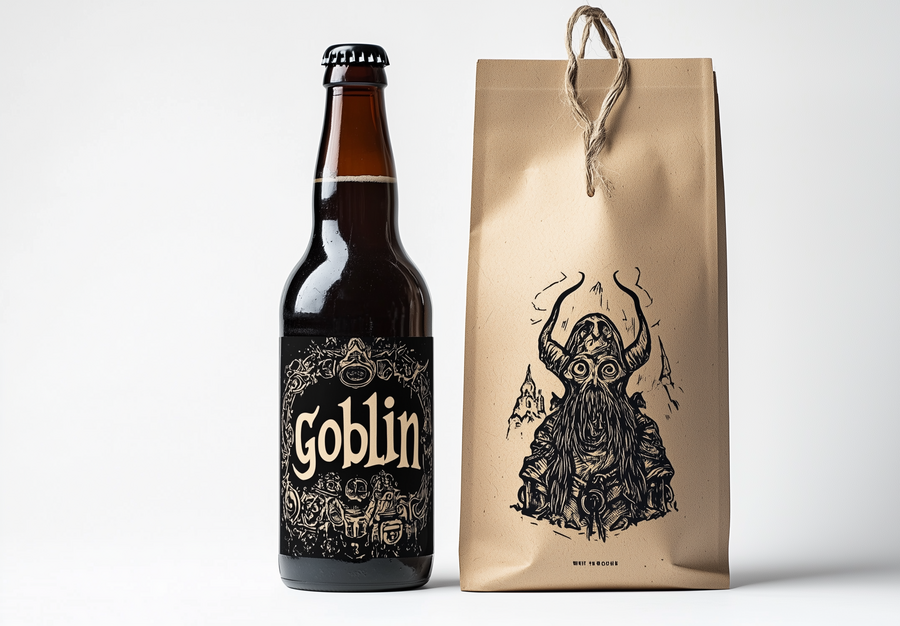 2. A full-body mockup of a craft beer bottle with «goblin» written on the label in large letters and dark slavic mystery illustration, wrapped up and sitting next to it is its cardboard bag packaging, flat lay, white background, studio photography, product design photography, high resolution. --ar 128:89 --v 6.1
