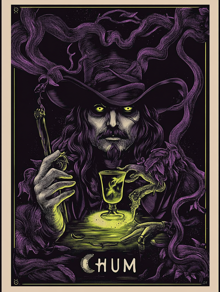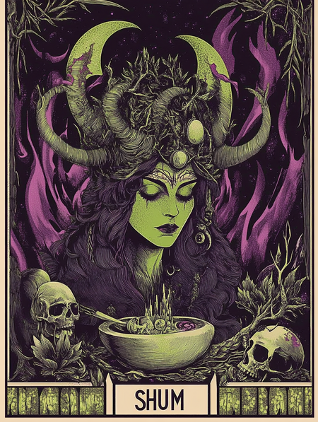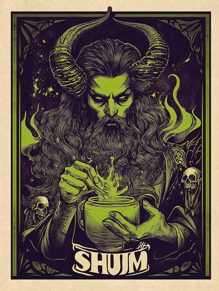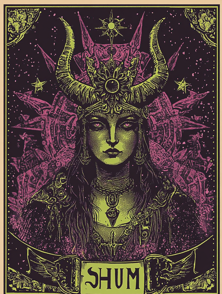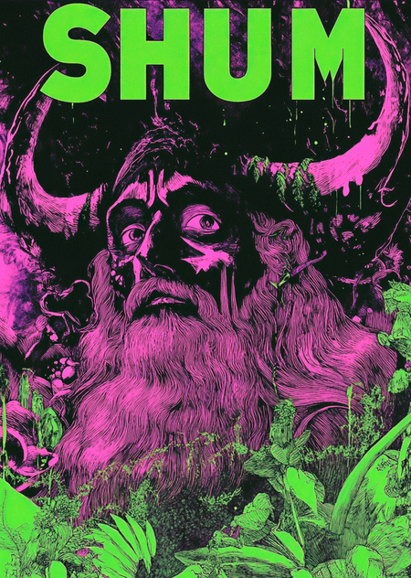 Create poster for the SHUM bar brand in slaviс darkfolk style using bright purpule and acid green colors. --ar 3:4 --v 6.1