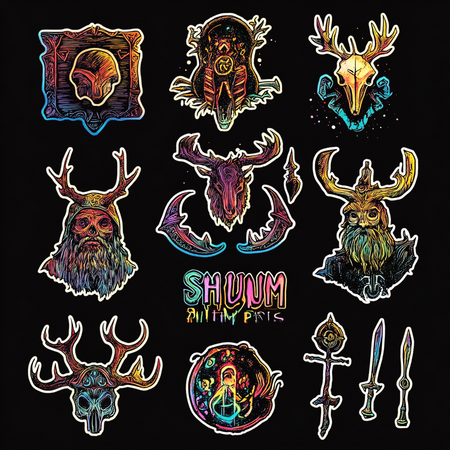 2. generate a variety of darkfolk neon style stickers with slavic fairytale characters for the SHUM bar on a black background