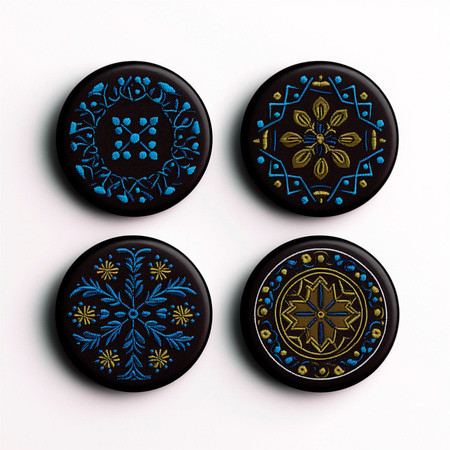 1. A set of four round pin-back button mockups, with a black and purple color scheme, featuring an embroidered, green, slavic pattern on the front, and blank space for text or design inside each badge. The designs have rounded corners to add depth, and all buttons display their own unique design. A plain white background highlights these sleek and modern, slavic-inspired pieces.