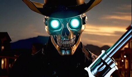 «Ржавый закат» (3-минутный клип в стиле нео-вестерн/киберпанк без диалогов) • 00:00–00:50 «ГИБЕЛЬ В ПУСТОТЕ» — Рассвет. Улица. Настоящее. - Экстремальный wide-shot: пустынная улица городка в стиле вестерн, красное солнце выходит из-за силуэтов деревянных построек. Пыль клубится между экстерьерами. - Медленный зум на неоновую вывеску салуна «The Rusty Spur». - Резкий переход: камера резко опускается вниз, открывая труп ГГ — робота-ковбоя с усами, еле подвижными конечностями и гаснущими глазами-диодами. - Погружение в воспоминание: Камера приближается к потухшему глазному сенсору. Экран дрожит, переход в черноту — флешбек. • 00:50–01:22 «ПОСЛЕДНИЙ ТАНЕЦ» — Салун. Вечер. Прошлое. - Интерьер: Тёплый «масляный» свет ламп. Роботы-ковбои в разгаре веселья. -Барная стойка: робот наливает масло в стаканы. Жидкость переливается желто-оранжевыми оттенками. - Танцпол: робо-девушка и робот- ковбой кружатся в танце. - Игра в цу-е-фа: роботы используют руки-механизмы, изображая «камень», «ножницы», «бумагу». - Конфликт: один из игроков-бандитов резко встает, хватает за шею ГГ. Драка постепенно перерастает в хаос, охватывая весь салун. • 01:22–02:20 «ДУЭЛЬ ПОД НЕОНОВОЙ ЛУНОЙ» — Улица. Ночь. Дуэль. - ГГ выходит из салуна, а перед ним уже стоит робот-бандит. - Крупный план: Руки замерли у револьверов. -Выстрел: пуля пролетает в сантиметре от камеры. В воздухе остаётся раскалённый след, дым стелется из ствола. -Развязка: ГГ убивает рейнджера, но в момент триумфа получает выстрел в спину. - Камера переходит на убийцу — робота охотника за головами с лицом скелета, который разыскивал ГГ по постеру с объявлением о награде. • 02:20–02:41 «РЖАВЫЙ РАССВЕТ» — Возвращение в настоящее. Рассвет. - Камера вылетает из глаза мертвого ГГ — мы снова на улице утром. Тело лежит абсолютно неподвижно, глаза-диоды не горят, знаменуя гибель персонажа. - Охотник за головами уже в седле лошади и едет в сторону пустыни, выполнив свою работу. Он трет свою шляпу и ухватившись крепче за поводья устремляется в сторону камеры.