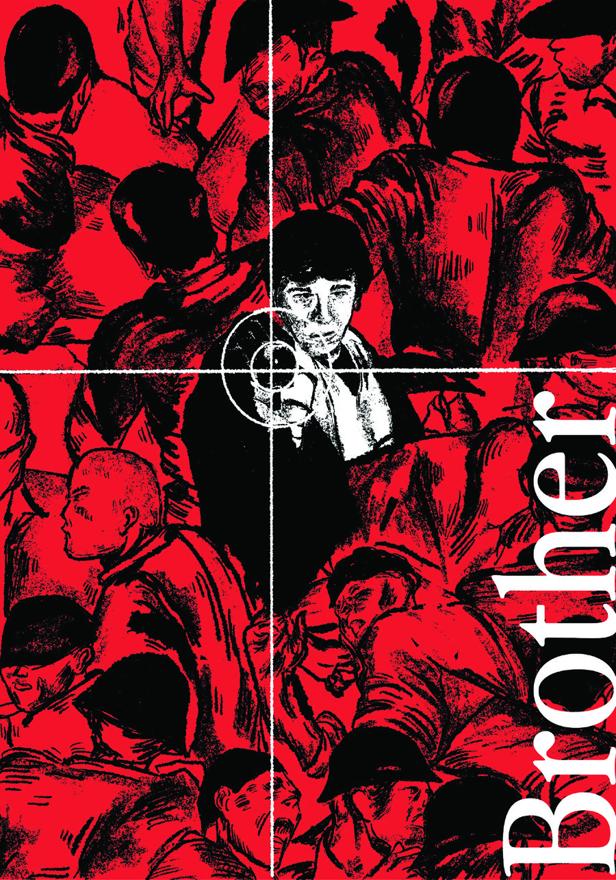2. Second Alternative Poster The poster for Brother (1997) features an illustrative composition dominated by red and black, reflecting the brutal and suspenseful atmosphere of the post-Soviet Russian criminal underworld. Amidst a crowd of people with dark and chaotic expressions, the protagonist, Danila Bagrov, stands tall with a gun pointed at him, as if at the center of an inescapable conflict. The gun’s aiming line divides the poster, emphasizing the theme of violence and the struggle of living in St. Petersburg’s underworld. The vertical typography on the word Brother adds a sense of sternness and coldness, in line with the movie’s exploration of loyalty, morality and self-discovery.