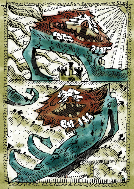 Средь руин и павших уцелевший герой находит поникшего художника: всё мертво, а долг висит. Помня о его работах, герой бросается строить из подручных средств муляжи, имитирующие застывших в битве войнов, на место короля злорадствующе ставя себя.
