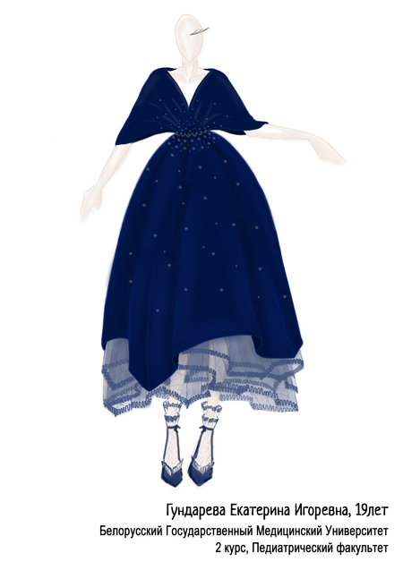 Настоящее ничто без прошлого, как будущее ничего не стоит без настоящего. Единственное, что объединяет время — небо, звездное небо, которое неизменно прекрасно. Модель несет в себе определенный подтекст силы времени: основная юбка и верх платья — звездное небо, ромашки — звезды неба, наше прекрасное будущее, а подкладка платья — прошлое, на котором зиждется настоящее. Как раньше укрывали тканым платком плечи наши предки, так по сей день звездное небо укрывает нас. А юбки платья в разложенном виде представляют квадрат — тот самый платок.