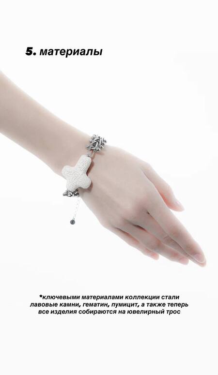 · Вулканическая лава: Каждый кусочек лавы — это свидетельство колоссальной силы природы. Прикосновение к такому камню напоминает о первозданной энергии, страсти и стойкости. Это символ любви, которая способна преодолеть любое препятствие. · Пумицит (пемза): Родственная лаве, но невесомая и пористая, пемза олицетворяет легкость, чистоту и свет. Это напоминание о том, что даже после извержения наступает умиротворение, а любовь может быть не только страстной, но и воздушной. · Гематин: Этот благородный серебристо-белый минерал, известный как «железная роза», добавляет коллекции скульптурности и холодного блеска. Он символизирует элегантную силу, надежность и вневременную красоту.