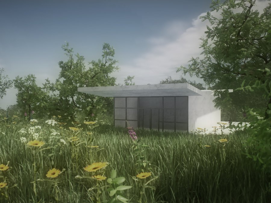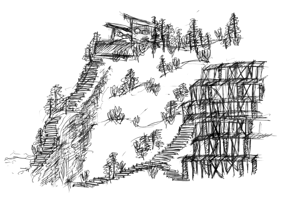 Вид из окна электрички на Красную горку, открывающийся с высоты моста над рекой, напомнил облик большого муравейника, живущего своей жизнью, поэтому прообразами архитектурных объектов стала геометрия жилищ насекомых: подземные ходы муравьев, кладка яиц жука, паутина. Кроме того, многочисленные облепиховые деревья и кусты натолкнули на создание чайного домика, наделенного различными функциями, как центра комплекса.