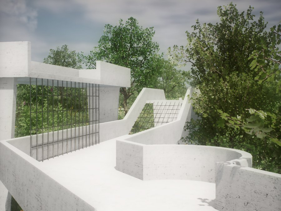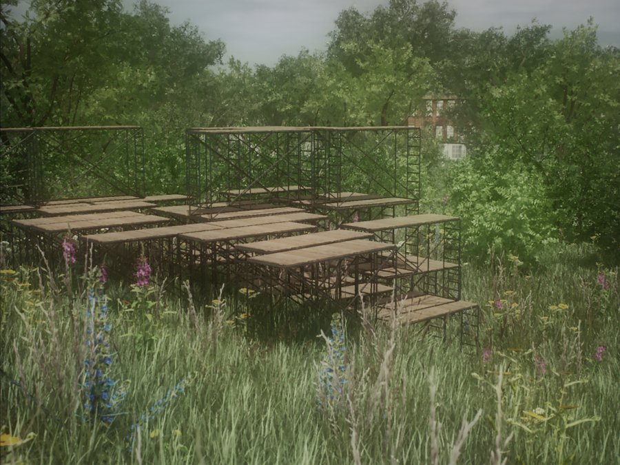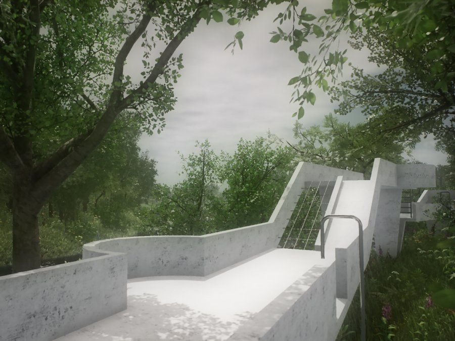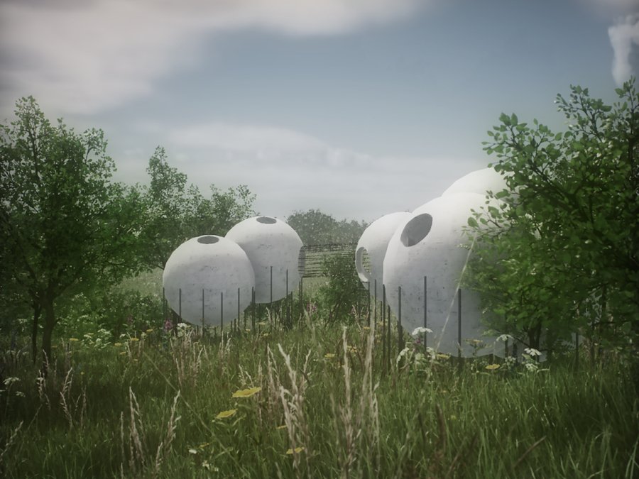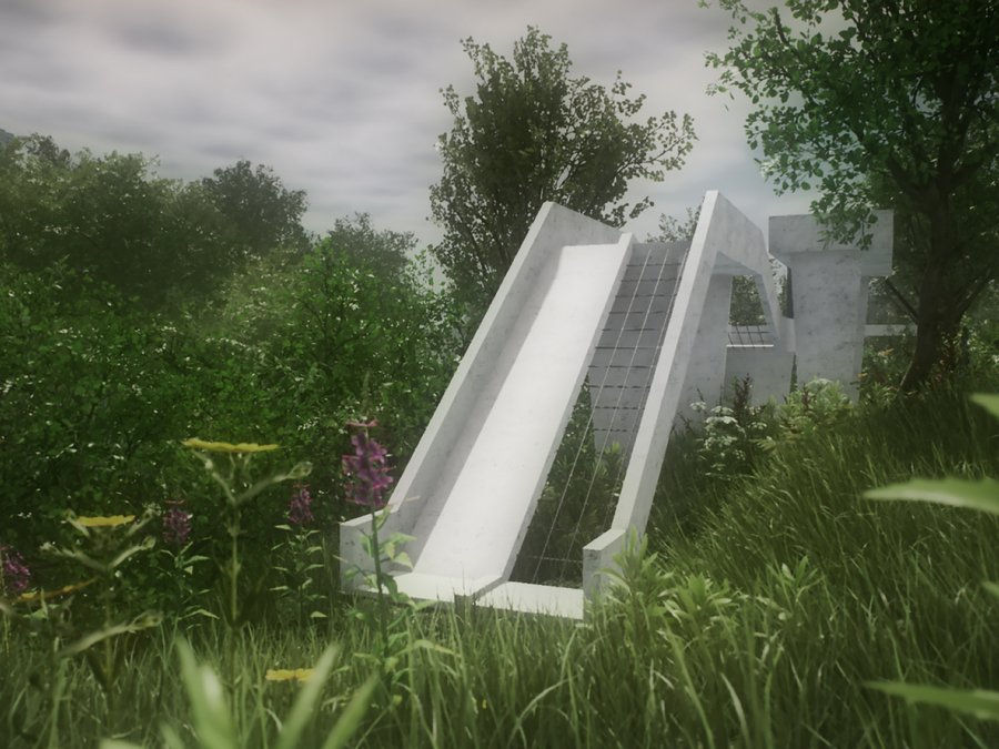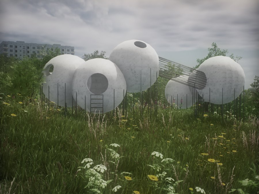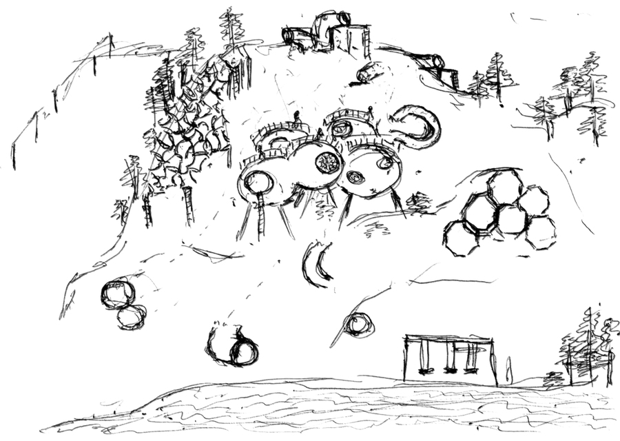 Детский городок состоит из четырех зон: площадки из бетонных сфер, тропы, конструкции из строительных лесов и чайного домика. Важной задачей при проектировании стала необходимость в построении диалога между архитектурой и рельефом местности. Таким образом элементы городка, стоящие на наземных опорах, повторяют высотность ландшафта и акцентируют форму надпойменных террас реки Пахры. Так тропа делает более выразительным ее движение, конструкция из строительных лесов взаимодействует с платформообразной стороной ландшафта, бетонные сферы указывают на начало более крутого подъема холма, а также чайный домик подчеркивает топографию местности.