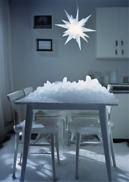 (advertising lamp, apartment, furniture ikea magazine, porcelain package, white cold glacier star soft light contrast image commercial image, harun farocki cinema frames, beautiful icy crystals arctic shot, no people)