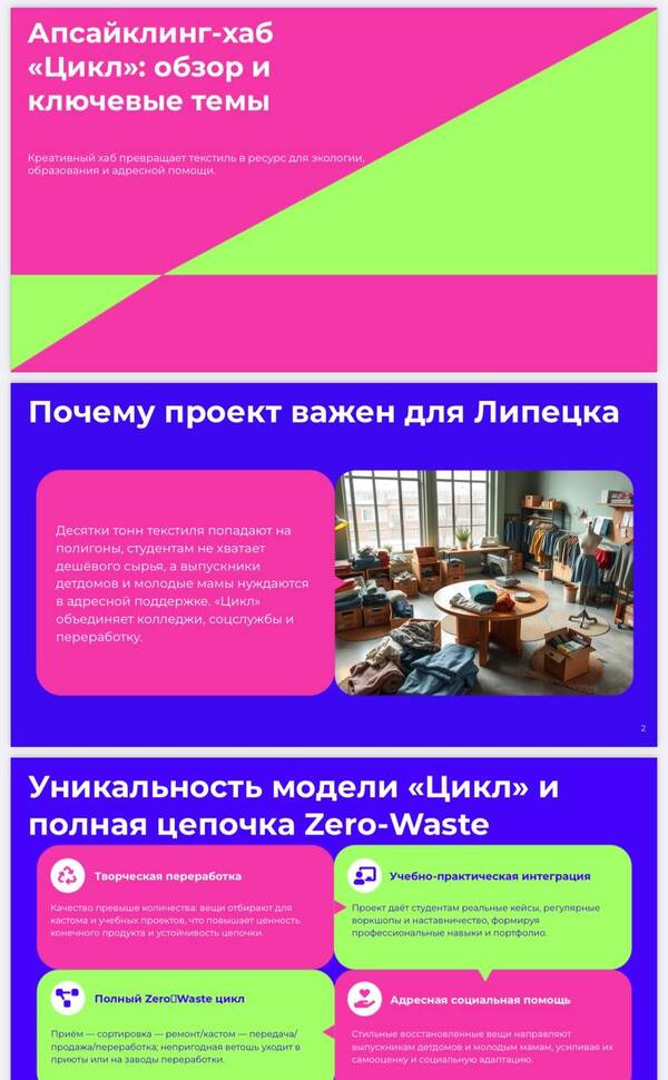Подробное описание Вашей деятельности: Обучение молодежи принципов Zero-Waste и устойчивой моды Польза для населения и города (области): · Бесплатное сырье для студентов суз дизайнеров Для выпускников детских домов и молодых мам: · Адресная поддержка качественными, стильными вещами, которые помогают строить новый образ и укреплять самооценку · Психологическая поддержка через возможность выглядеть хорошо и чувствовать свою индивидуальность Для города и области: · Снижение объема текстильных отходов · Поддержка талантливой молодежи и создание кадрового потенциала для креативной индустрии города · Усиление адресной социальной поддержки уязвимых групп · Популяризация осознанного потребления и волонтерства