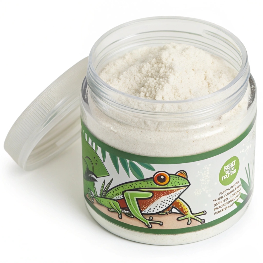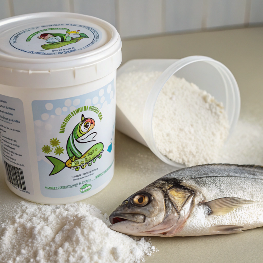 A plastic jar of white powder with an amphibian-themed label. Nearby a fish and white powder