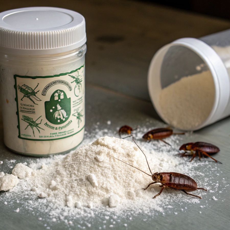 Promit: A plastic jar of white powder with an amphibian-themed label. Nearby a cockroach and white powder.