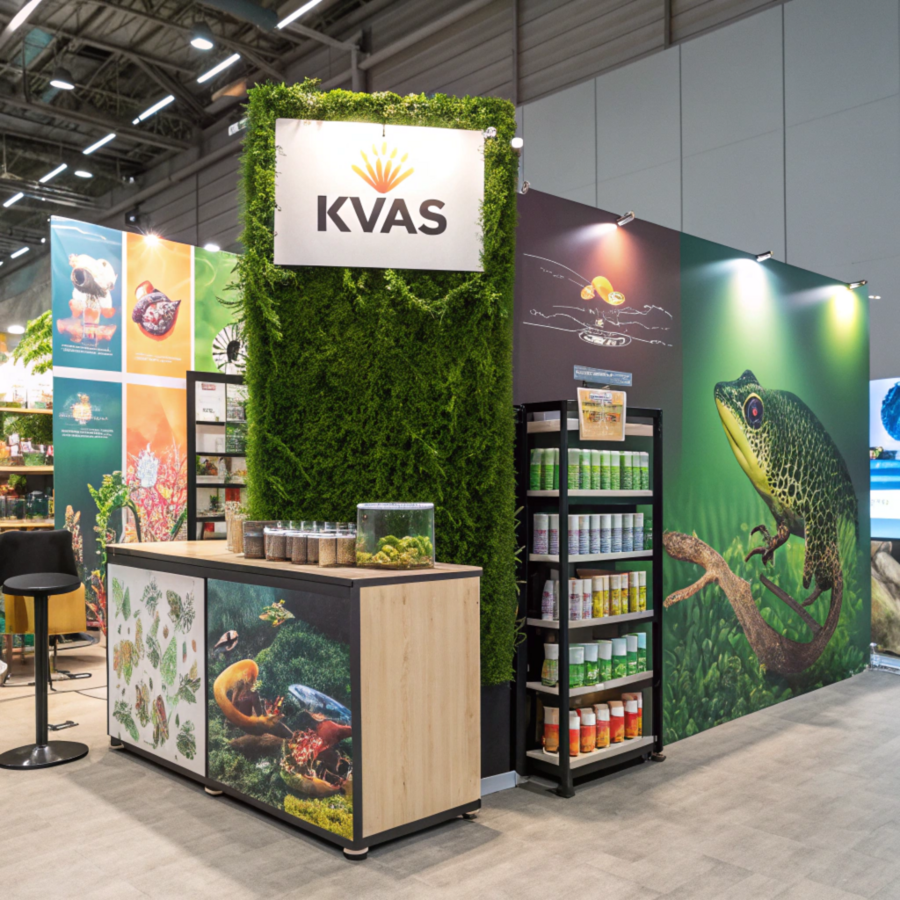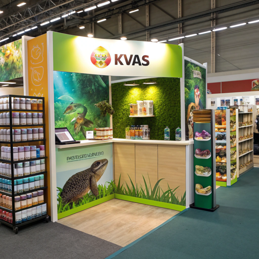 At the center of the booth stands a large tank filled with healthy-looking amphibians, demonstrating the positive effects of using KVAS products. Experienced staff members are readily available to answer any questions visitors might have about the supplements, their usage, and the specific needs of different species.