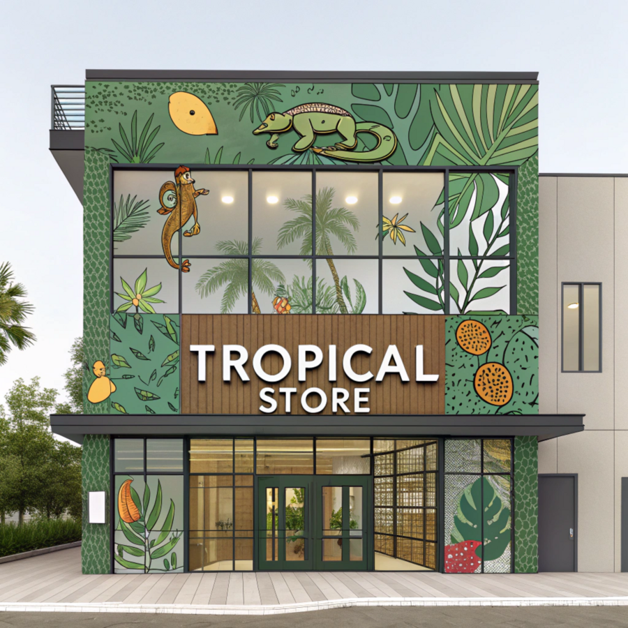 Promit: Building Design - Facade: The facade can feature a combination of modern and tropical elements. - Colors: Predominantly green, with accents in earthy tones such as brown, tan, and olive. - Windows: Large glass windows allow passersby to see inside the store,